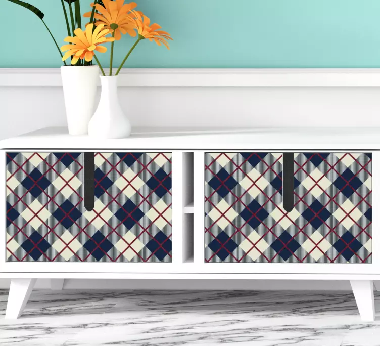 该产品采用精致的格子图案,结合了海军蓝、奶油色和红色调,以引人注目的几何排列展现。其设计融入了优雅与时尚简约的元素,非常适合提升家居装饰中的各种表面。