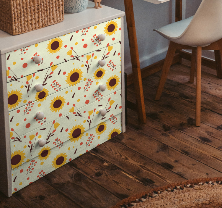 一个充满活力的设计,特色是向日葵和细腻的花卉元素。这个图案营造出愉快的氛围,非常适合为家具增添亮色。其生动的色彩和多样的形状创造出一种清新而诱人的环境,非常适合在室内增添自然气息。