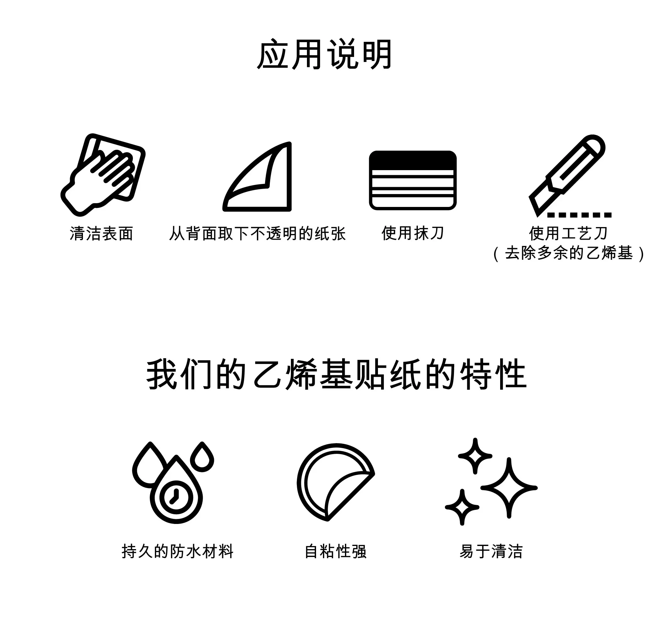 表面准备: 表面必须干燥、清洁(无灰尘、液体或污渍)、光滑且无孔。墙面建议使用乳胶漆。如墙面刚刷漆,请等待 4–6 周。可用水或酒精清洁,切勿使用玻璃清洁剂。黑板贴纸需要完全光滑的表面。收到后请立即展开并压平贴纸。