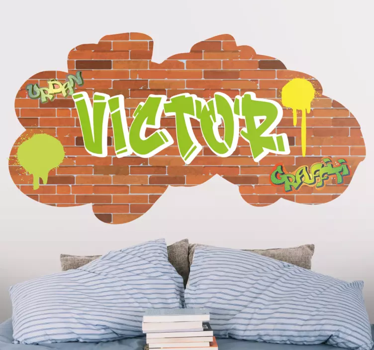 这是一件充满活力且可定制的作品,采用粗犷的涂鸦风格在砖墙背景上展示一个名字,点缀着色彩的飞溅。非常适合为任何空间增添个人风格,这一设计提升了城市美学,同时允许个性化表达。