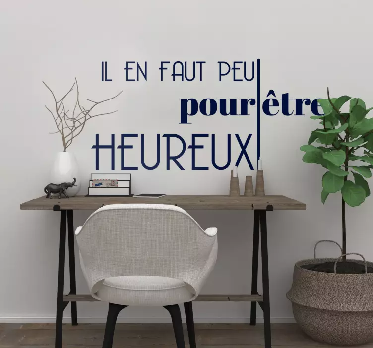 一个文本设计,内容为“几乎不需要高兴”。将其用作目录中任何一种颜色的客厅装饰。以您的方式定制设计以美化所需的空间。文本墙贴花也可以在卧室中使用。从字段中提供的尺寸中选择一个尺寸。它由非常优质的乙烯基材料制成。使用刮铲可以将其平稳放置,并且不会产生皱纹或气泡。直接从我们在线购买,几天后即可发货。可以随时将其删除而不会出现问题。