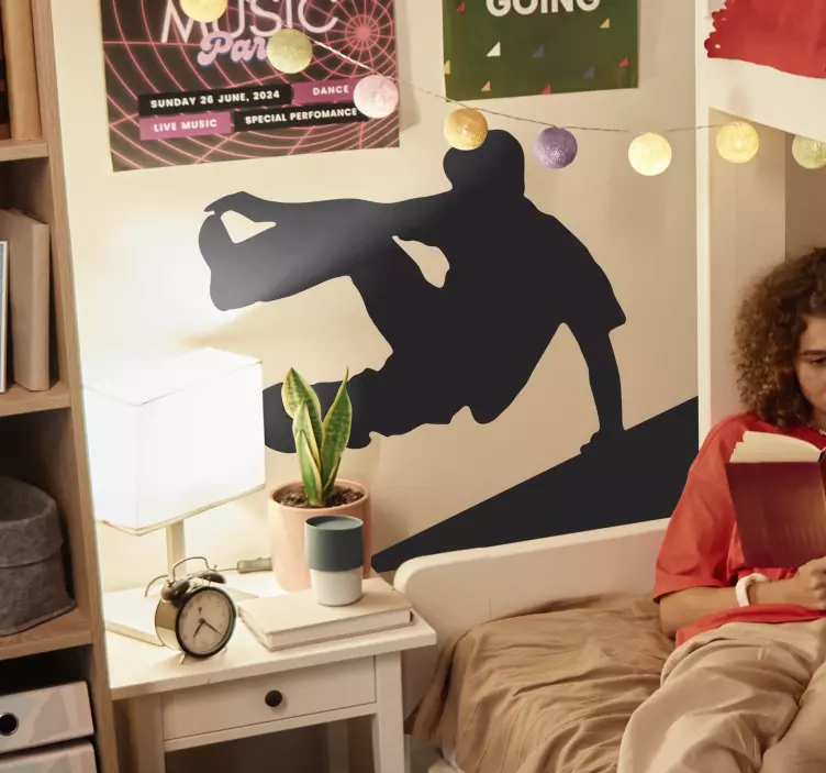 一名年轻男子跳过一堵墙,因为他自由穿过街道。使用此跑酷墙贴,以您想要的任何颜色为卧室墙壁添加一些动作。如果你喜欢跑酷和自由奔跑,你会喜欢这款极佳的动作镜头墙贴纸,是最好的极限运动,非常适合在家中或健身房的任何房间创造都市美感。