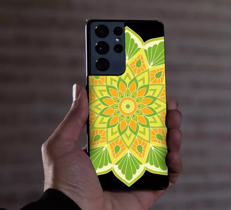一个充满活力的花卉曼陀罗图案,展现出复杂的几何形状,色调为绿色、黄色和橙色。这个设计结合了自然元素,创造出和谐且引人注目的外观,非常适合提升任何个人物品。