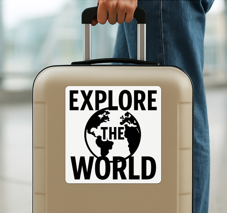 一位旅行者的行李箱上显眼地印有鼓励冒险的设计,标语为 'EXPLORE THE WORLD'。这个短语体现了探索和好奇的精神,邀请人们在旅行中拥抱新的体验和文化。地球的插图增强了这一信息,象征着全球探索。