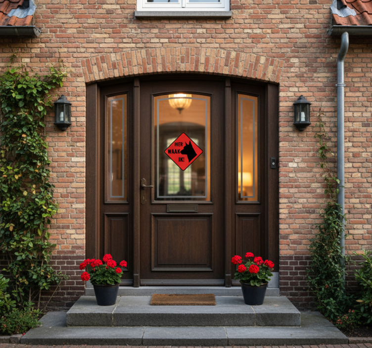 一个欢迎的入口处有优雅的木门,周围是温暖的砖墙。装饰性的灯笼增强了氛围,而生机勃勃的花卉盆栽则增添了一丝自然气息。一个引人注目的标志,展示了一只狗的轮廓,传达了一种警觉感,确保客人们意识到这里的环境。