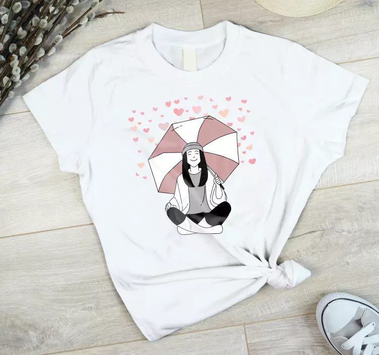 欢迎来到我们的T恤衫迷人心形图案的世界!这款T恤的设计灵感来自于可爱的卡通女孩,她手持一把雨伞,微笑着迎接生活中的每一场雨。在心形图案的衬托下,仿佛传递着满满的爱与温暖。其舒适的面料使得穿着者在任何场合都能感受到无比的随意与舒适。