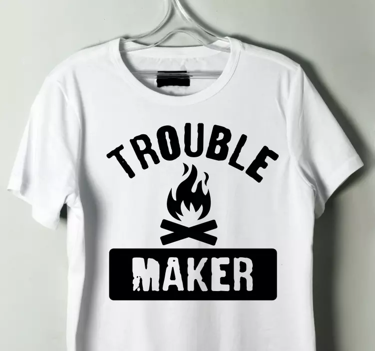 这个引人注目的设计以粗体字呈现'Trouble Maker',并配有火焰和篝火的符号。它非常适合那些拥抱乐趣和冒险精神的人。黑色与白色的对比增添了兴奋感,轻松吸引眼球。