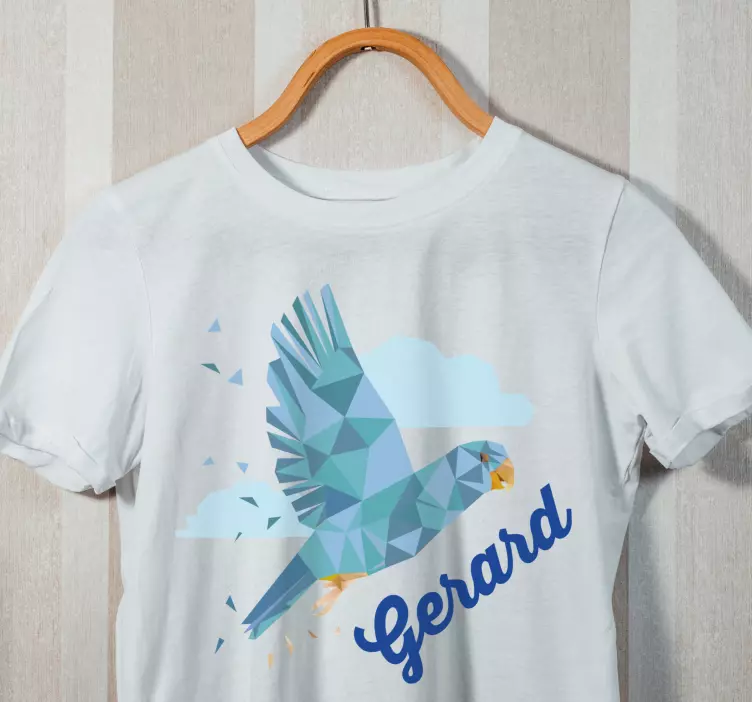 这个设计展示了一只飞翔的鹦鹉的几何表现,配以柔和的云朵。鲜艳的蓝色调营造出动感的外观,而名字 'Gerard' 则增添了个人化的触感。非常适合那些欣赏独特且引人注目的艺术作品的人。