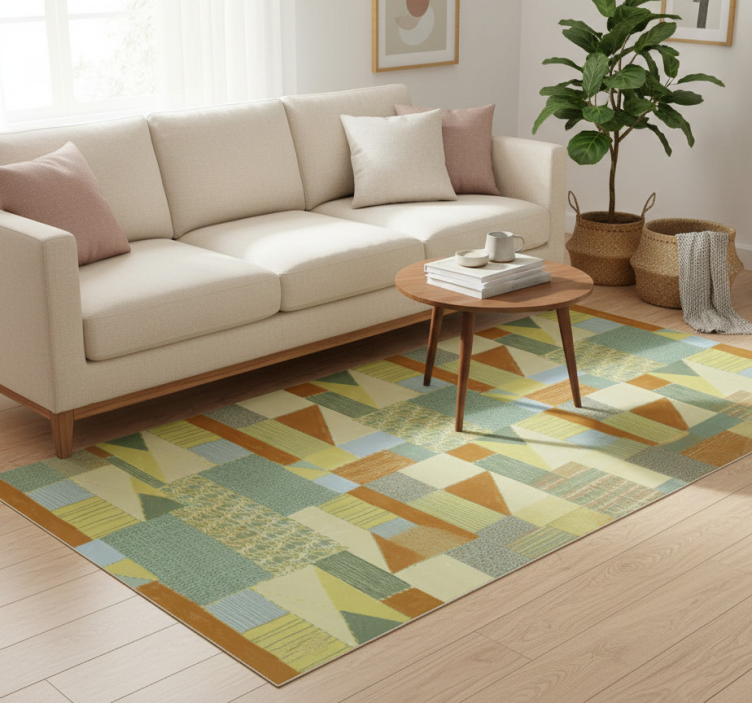 这幅图像展示了一个充满活力的几何设计,由多种形状组成,包括三角形、正方形和纹理图案。色彩调色板包含柔和的绿色、黄色和土色橙色,营造出和谐的视觉节奏。图案的排列提供了生动而平衡的构图,增强了整体的美感。