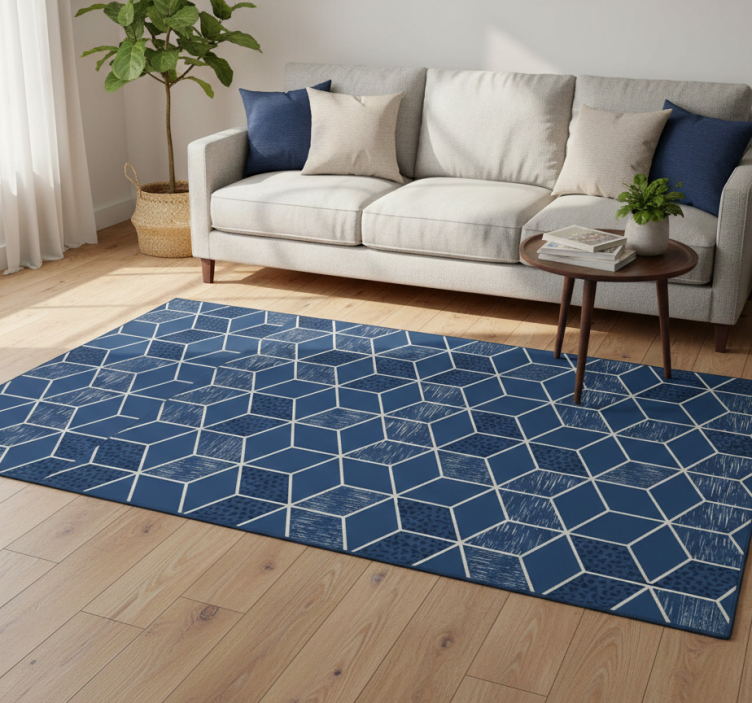 该设计采用复杂的互锁六边形形状,结合了不同深浅的蓝色,并在每个六边形内部呈现精致的纹理。干净的白色轮廓增强了几何图案,使其在深蓝色背景上形成视觉上的鲜明对比。