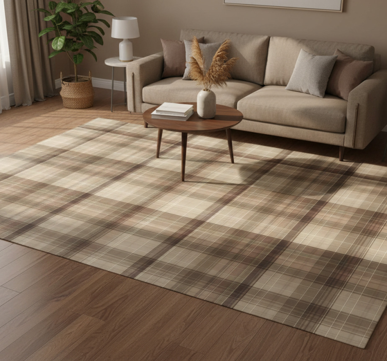 一个几何设计呈现经典的格子图案,特点是交替出现的奶油色、米色和土色棕色条纹。方格均匀分布,形成对称的布局,强调简约的同时带来温暖和舒适感。细微的色彩变化为整体设计增添了深度。