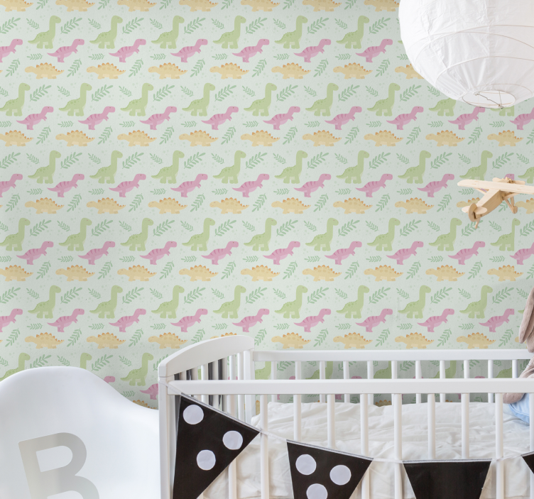 参考: P6439一个迷人的图案,以柔和的色调展现出活泼的恐龙,非常适合儿童空间。这个设计融入了可爱的恐龙,营造出一个温馨、吸引人的氛围,有助于培养想象力。