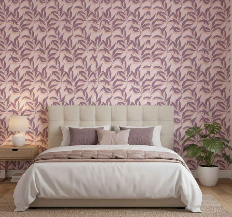 复杂的叶子图案在柔和的粉色背景上交织,唤起自然与宁静的感觉。紫色和柔和色调的细腻笔触创造出有机的流动感,营造出一种宁静的氛围。每片叶子似乎轻轻摇曳,为任何空间增添了一丝优雅的动感和优雅。